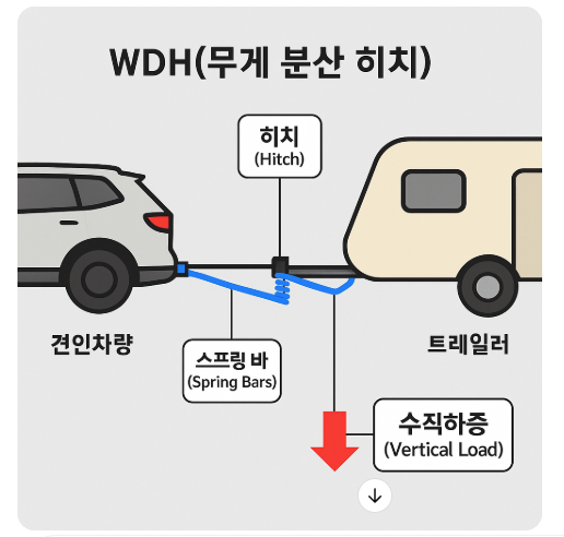 WDH는 일반 히치에 **스프링 암(bar)**이 추가된 구조예요.
