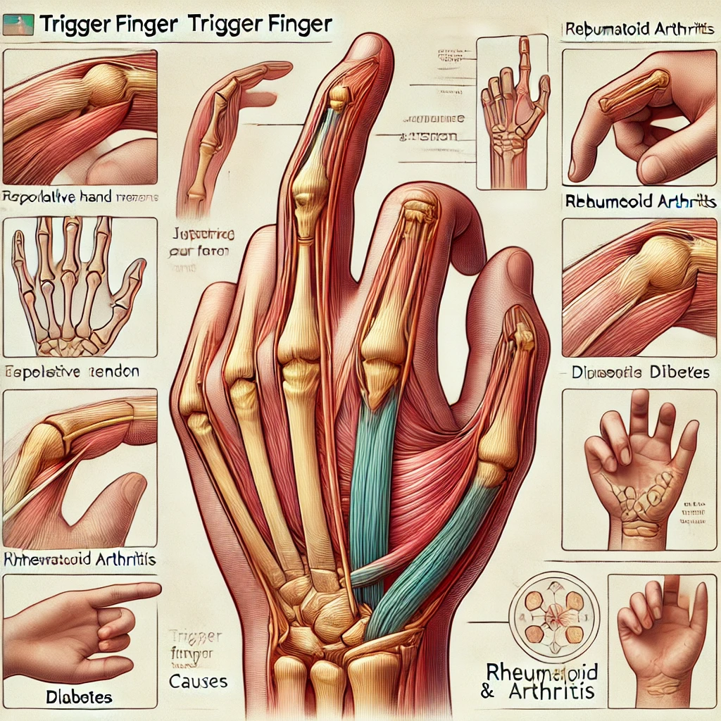 이 질환의 주요 원인은 손가락 힘줄을 감싸는 조직(건초)이 염증으로 인해 두꺼워지면서, 힘줄이 자유롭게 움직이지 못하는 데 있습니다. 이를 유발하는 요인은 다음과 같습니다.