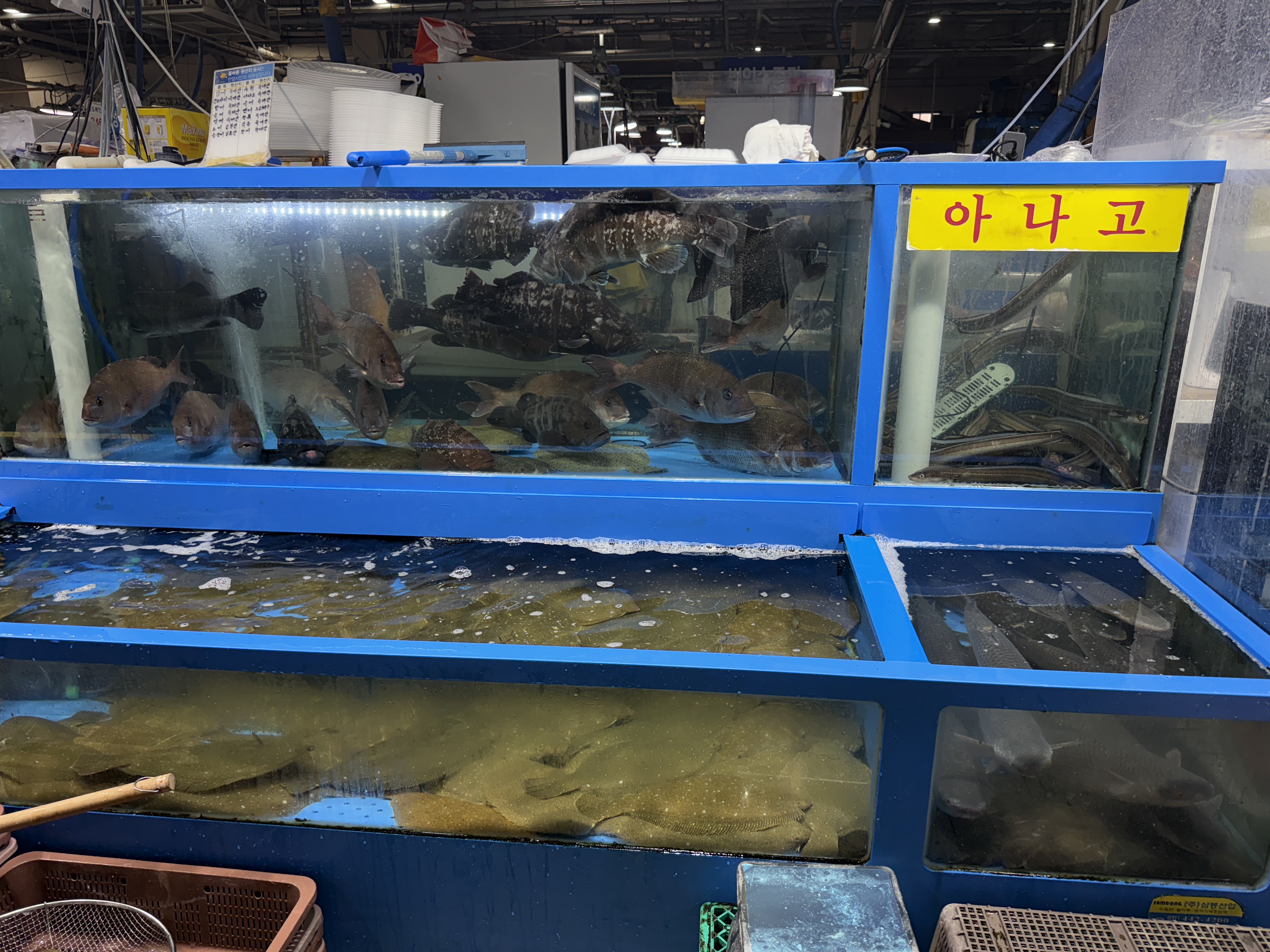 수족관 관리 상태도 깔끔했고, 물고기들이 활기차 보였습니다. 장사가 잘되는 곳이라 주문도 끊임없이 들어오는 모습이었어요.