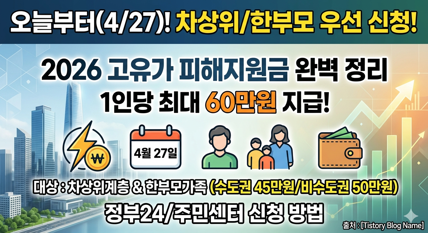 오늘 2026년 4월 27일(월) 오전 9시부터 기초생활수급자, 차상위계층, 한부모가족을 대상으로 하는 '고유가 피해지원금' 1차 신청이 시작되었습니다. 이번 지원금은 거주 지역에 따라 1인당 최대 60만 원까지 지급됩니다.