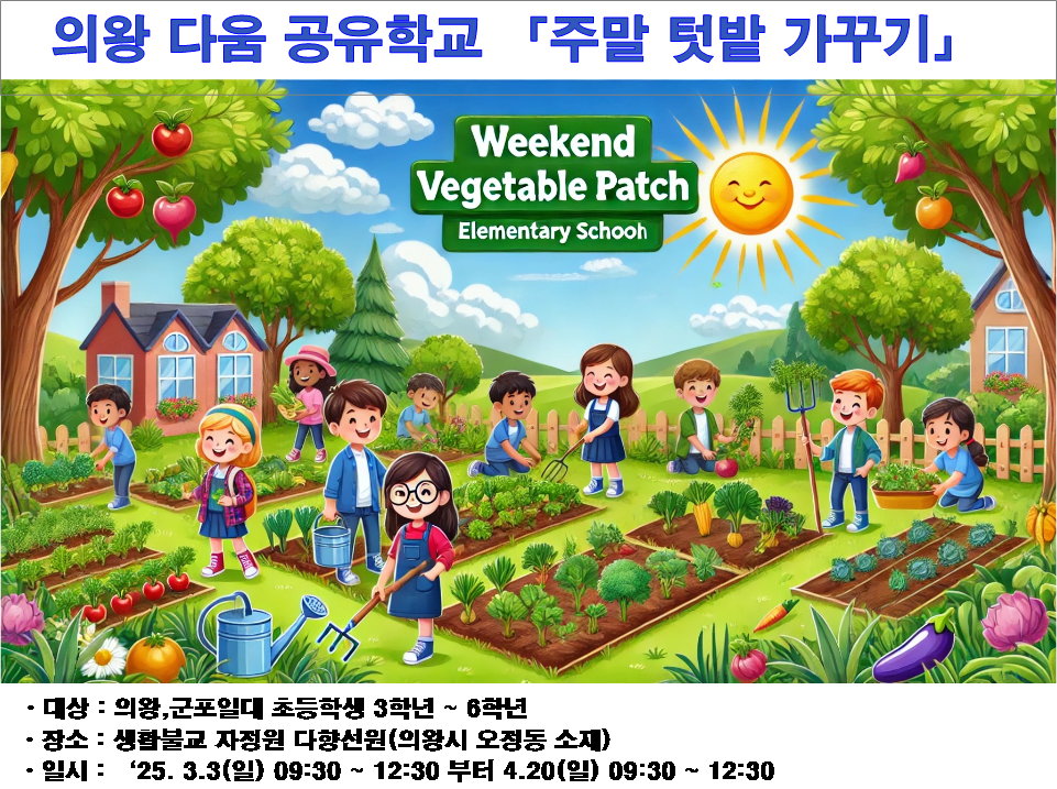 의왕 다움 공유학교에서는 초등학생(3~6학년)들을 대상으로 하는 「주말 텃밭 가꾸기」 프로그램을 운영합니다. 자연 속에서 직접 작물을 심고 기르는 경험을 통해 아이들은 농업과 생태계의 중요성을 배우고, 책임감과 협동심을 기를 수 있습니다. 이 프로그램은 의왕시 왕림길 71-33에 위치한 다향선원에서 진행됩니다.