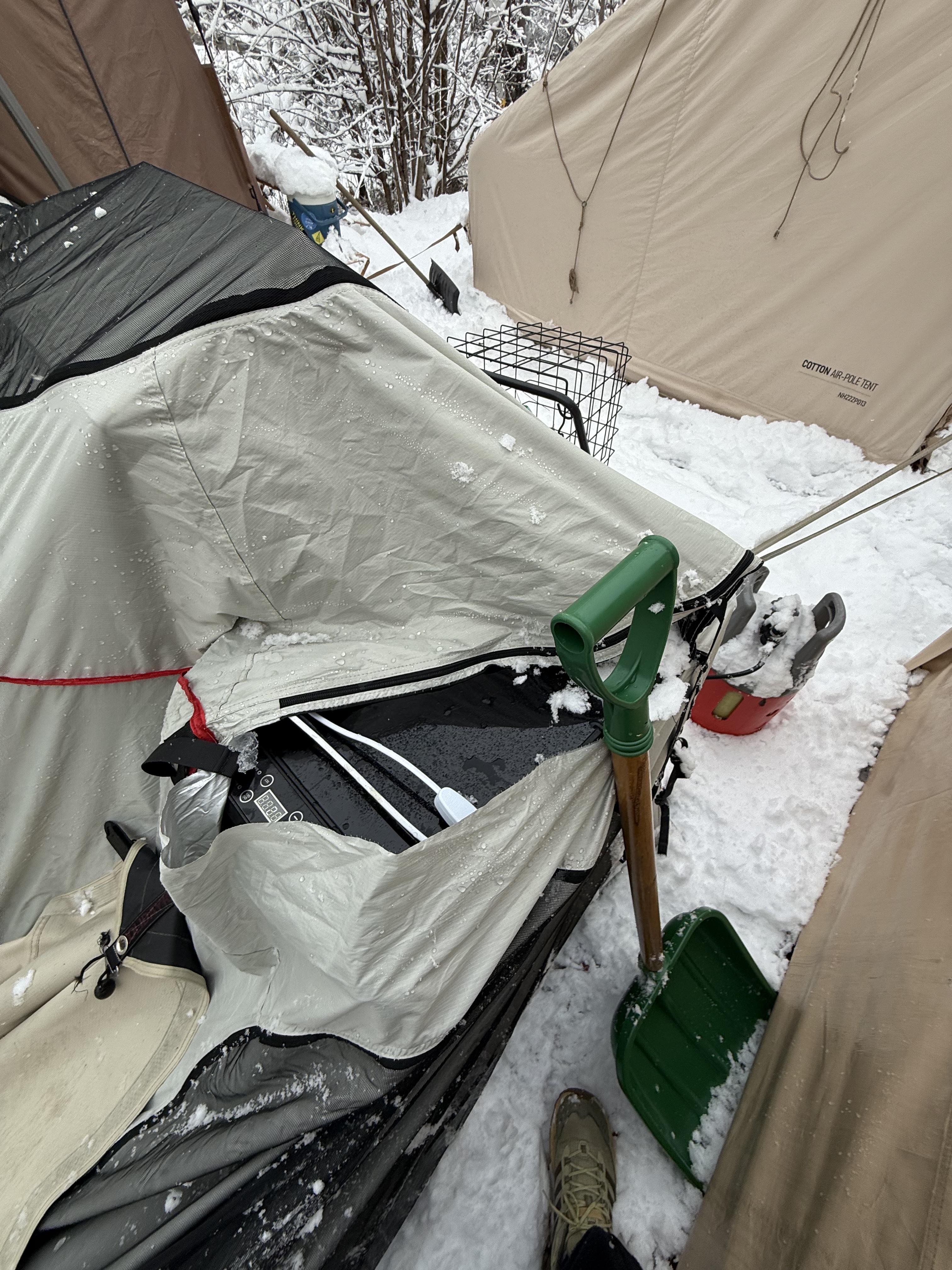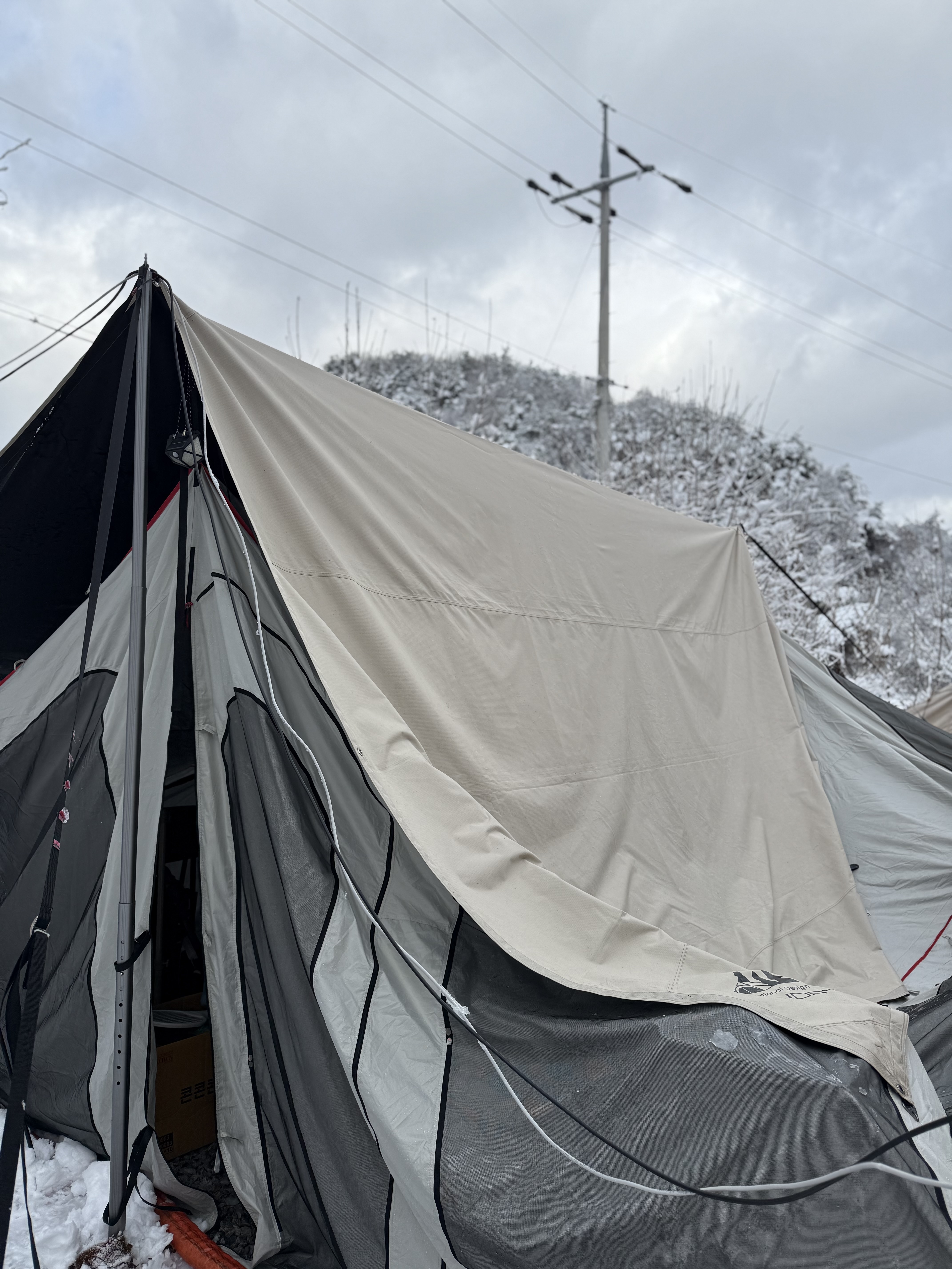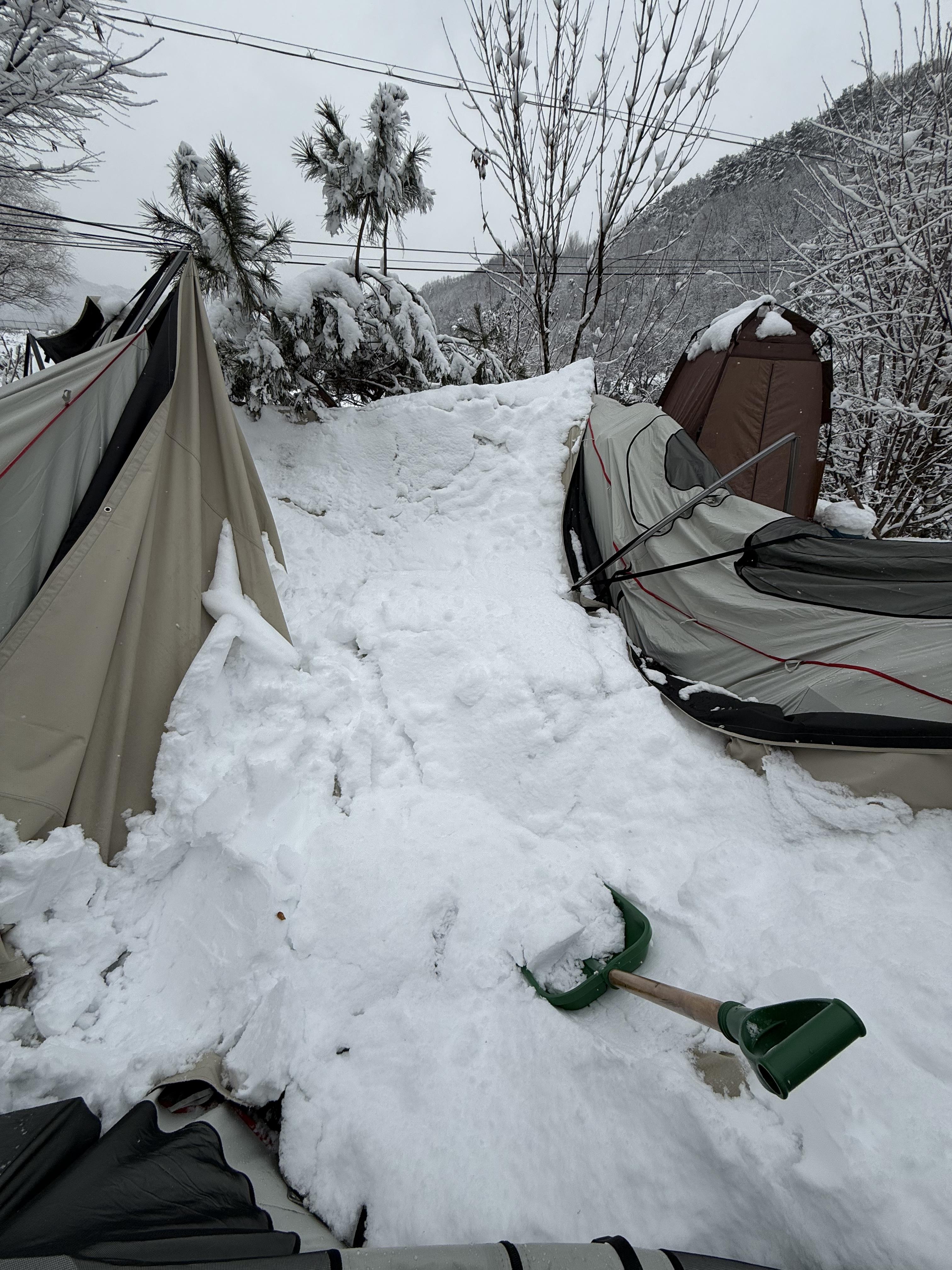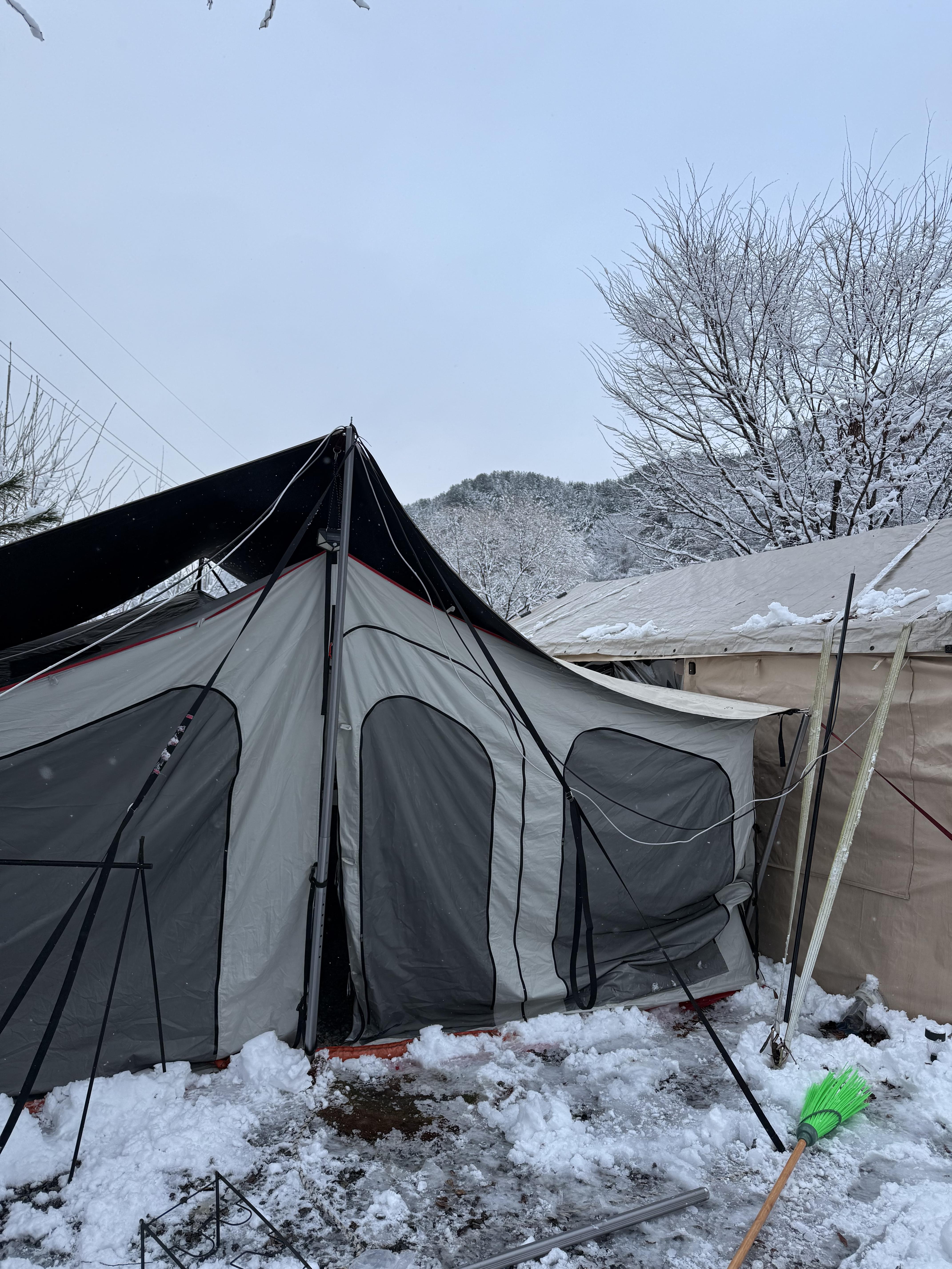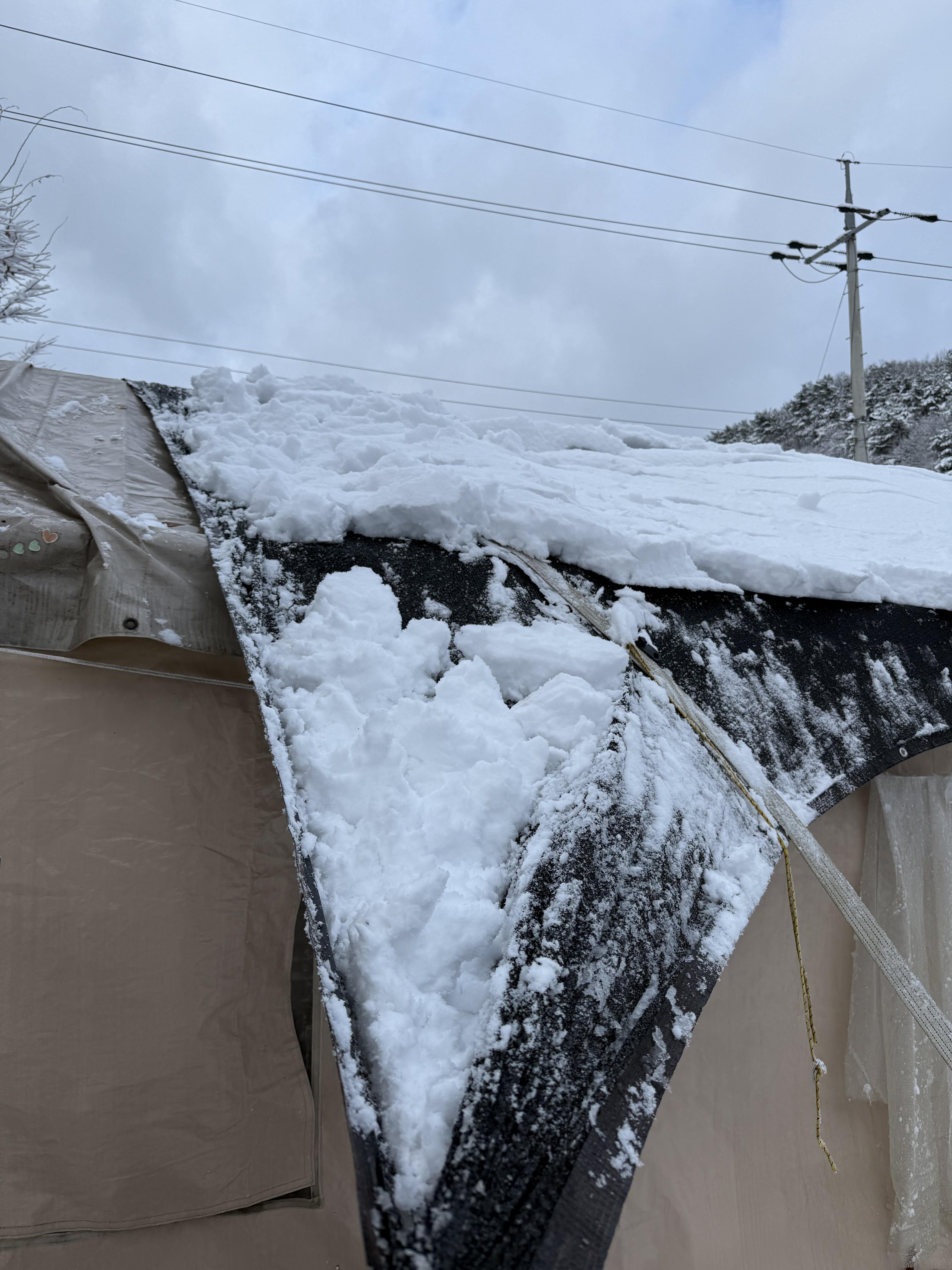 여름에 한창 더워서 텐트위에 인삼천을 덮었는데 그덕분에 눈이 아주 이쁘게 ? 쌓여서 무너질뻔해서
