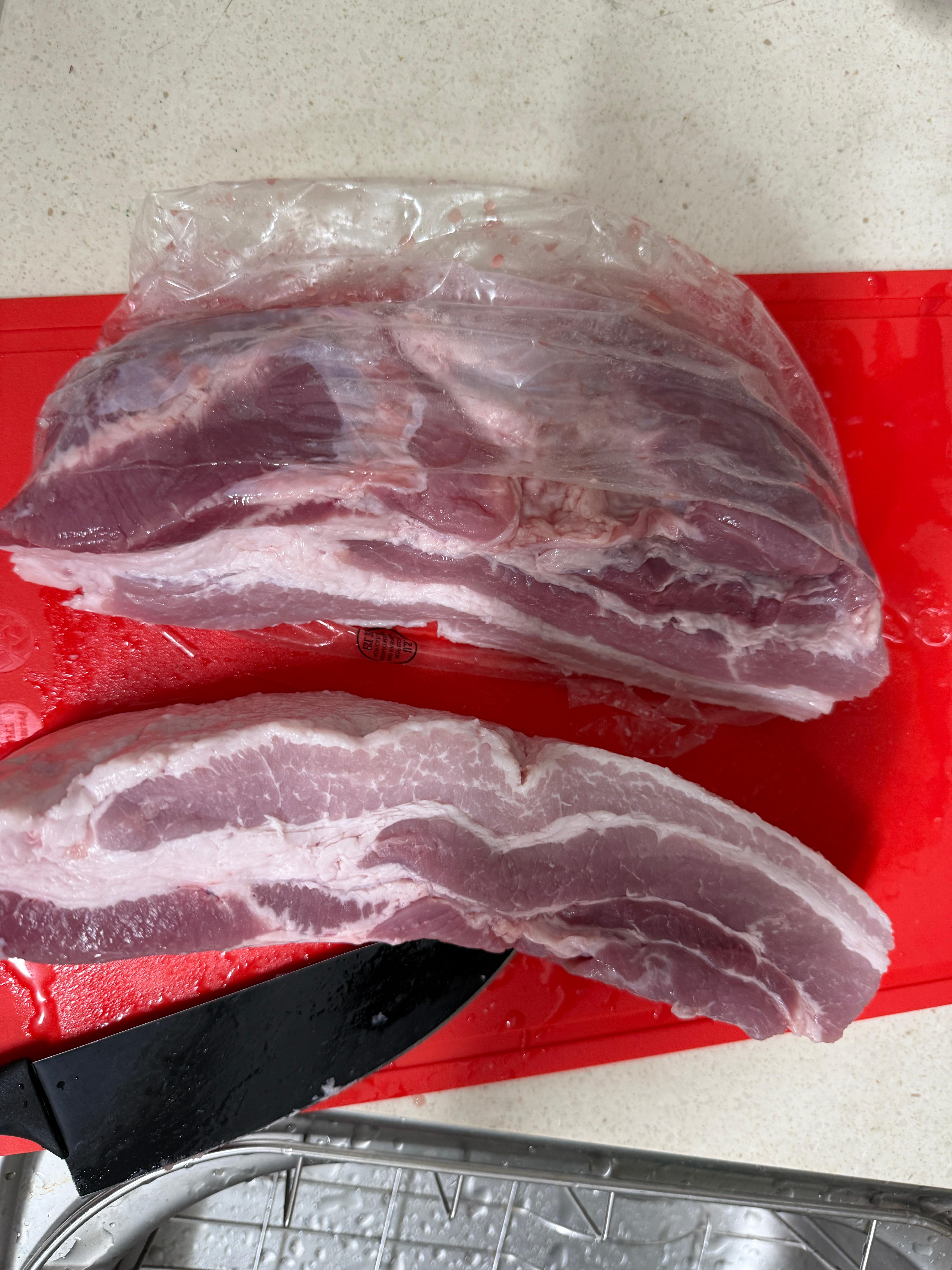 2. 저는 먼저 7cm 정도 두께로 썰어둡니다. 이렇게 손질하면 나중에 삼겹살 구이로 활용할 때도 편리합니다.